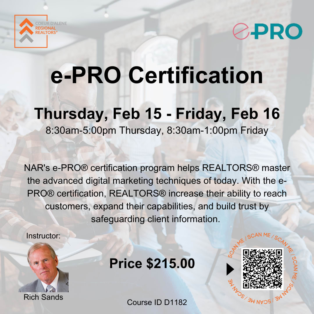 NAR's e-PRO® certification program helps REALTORS® learn how to leverage digital marketing theory and technologies in their day- to-day marketing efforts while protecting client information. Students will learn how to utilize advanced marketing tools and techniques including customer relationship management (CRM) systems, search engine marketing (SEM), search engine optimization (SEO), and social media to connect with customers. Students will also learn the importance of data privacy, the laws in place, and how to implement best practices as outlined by the Federal Trade Commission to protect client information from a data breach. Completion of this course will provide students with practical takeaways that can immediately be implemented to drive business and increase client confidence and trust.