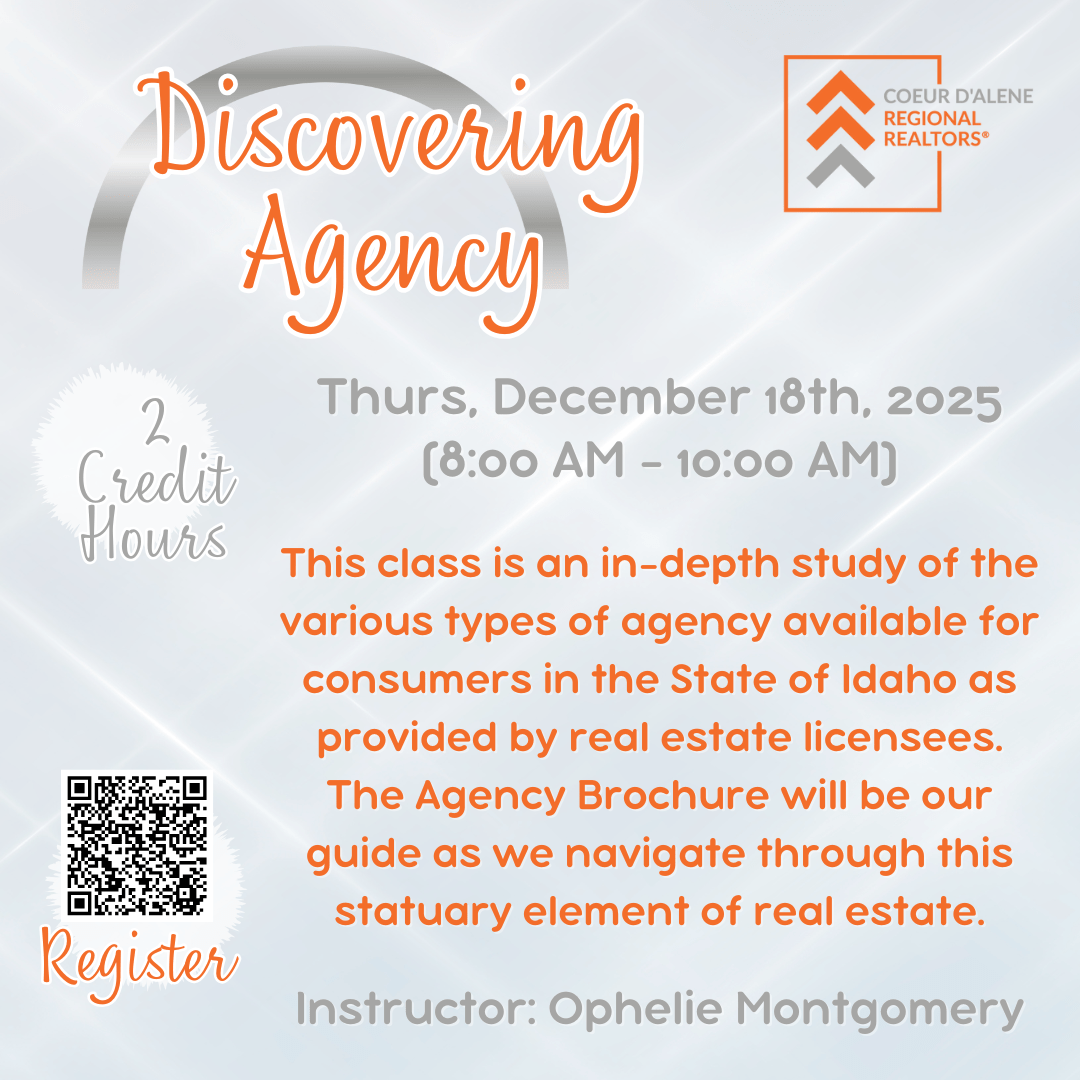 This class is an in-depth study of the various type of agency available for consumers in the State of Idaho as provided by real estate licensees. The Agency Brochure will be our guide as we navigate through this statuary element of real estate.